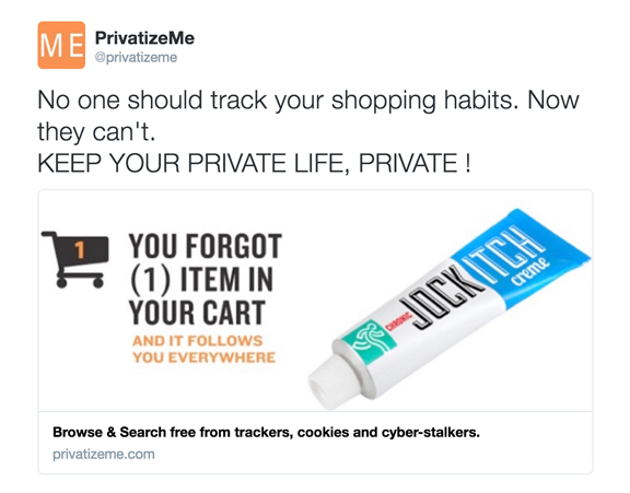In its first-ever advertising, PrivatizeMe LLC, Durham, N.C., targets seven disparate social sectors with little in common… other than a preference not to be targeted at all. They are: gun enthusiasts; porn consumers; college-or-higher-educated African Americans; people with STDs; people with personal hygiene issues; survivalists; and the LGBT. Ads for an eighth target market, the overweight, were rejected and did not run. PrivatizeMe is a browser add-on that removes cookies, making the attention-averse and their web histories invisible to and unreachable by the sites they visit.